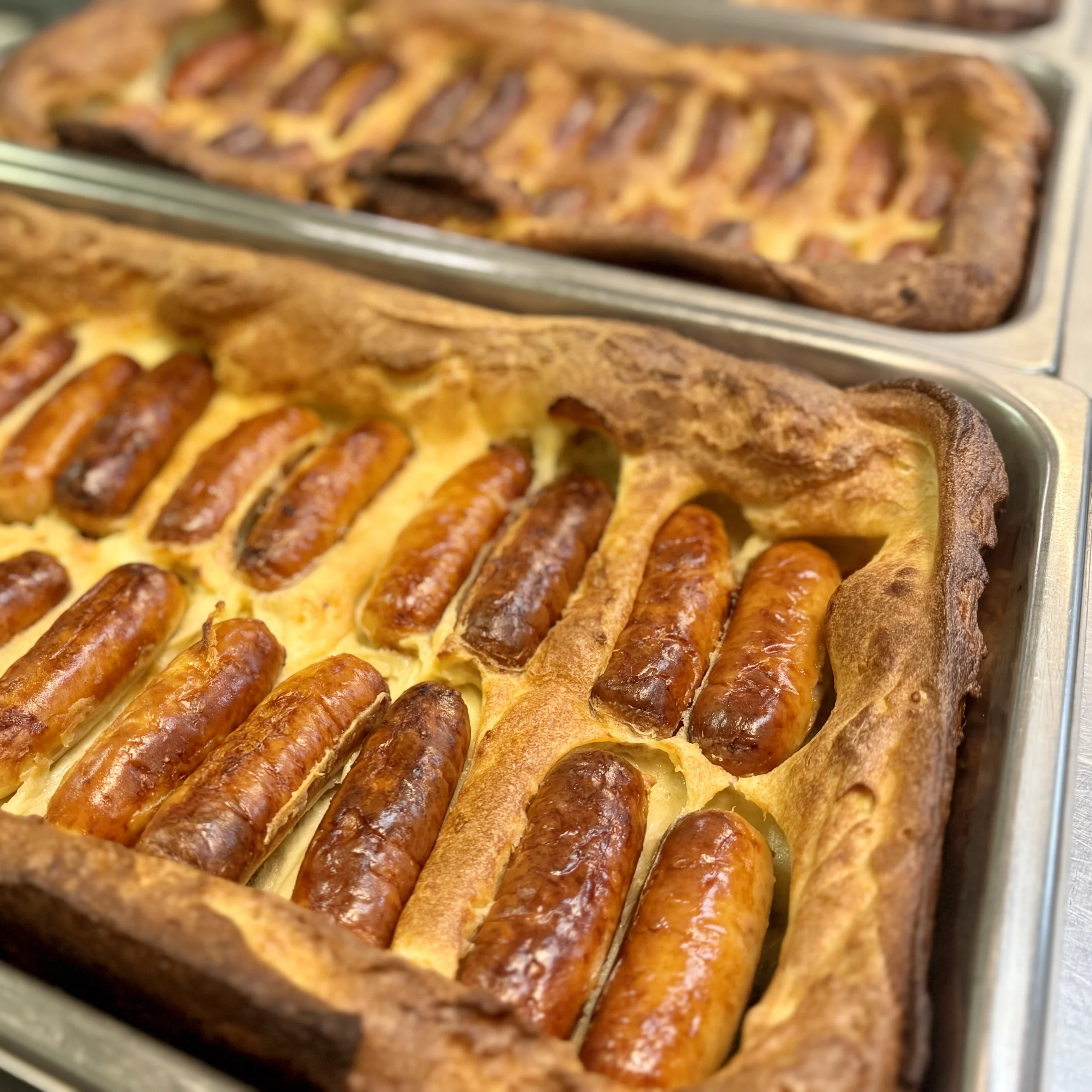 Pork sausages baked in Yorkshire pudding with pan gravy